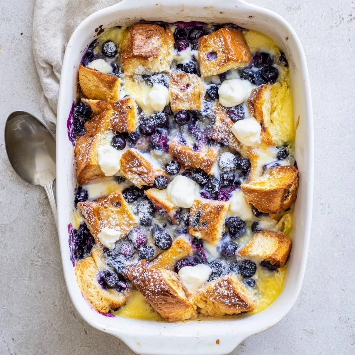 Yes, frozen blueberries work well. Thaw and drain them first to prevent excess moisture from making the casserole soggy.