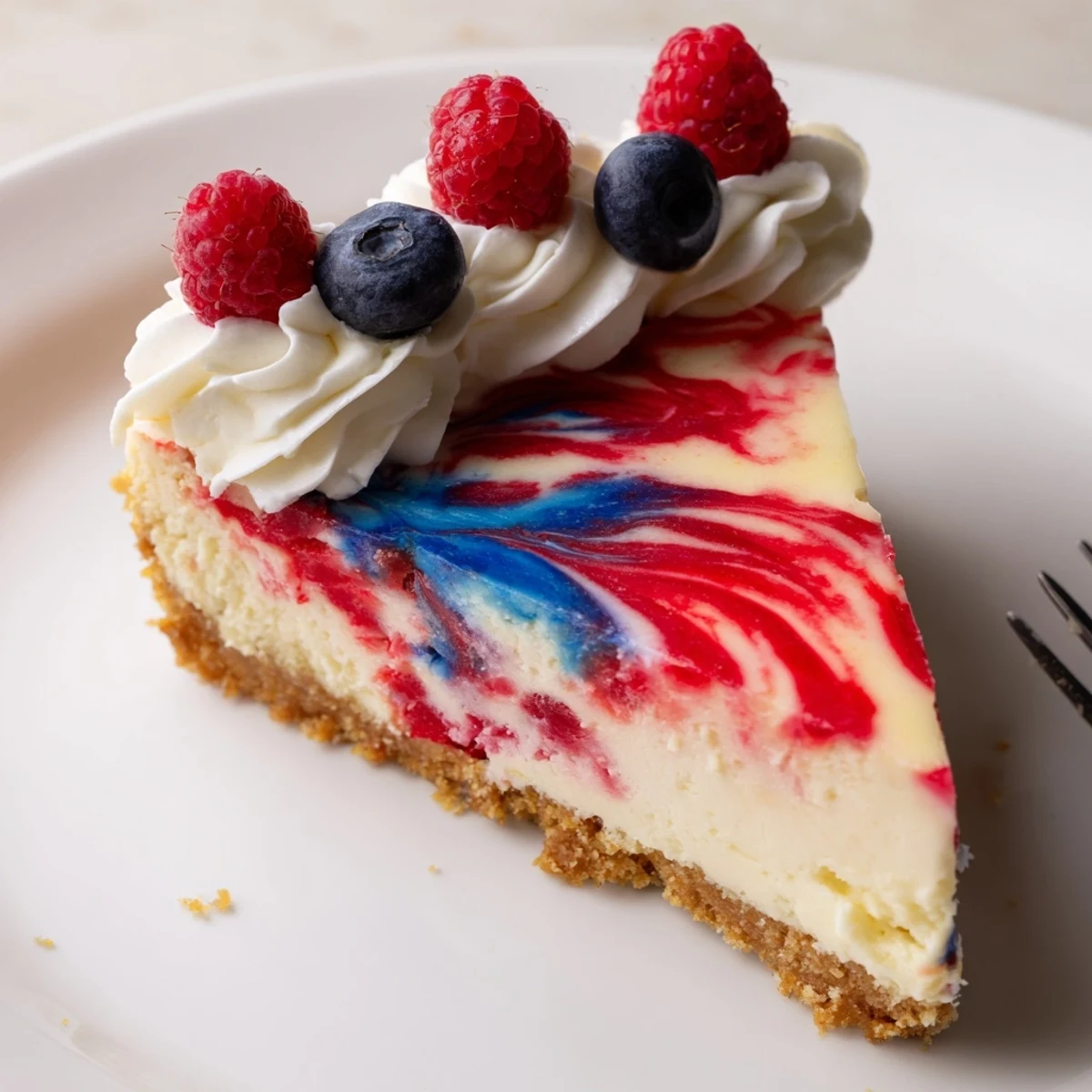 This festive cheesecake pairs a buttery graham crust with a silky, tangy cream cheese filling split and tinted for bright red and blue swirls. Bake at 325°F until the center is just set, cool slowly with the oven door cracked, then chill at least three hours to firm. Use gel colors for vivid marbling, avoid overmixing to keep distinct patches, and top with whipped cream or fresh berries for extra flair.